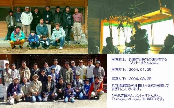 2004年3月28日、滋賀県ガリバーフィシングガーデンにて、ひらめき爺さん企画立案の幹事持ち回りのオフラインミーティング "OLM of the chain" の2回目が開催されました。今回も既に恒例行事となりつつある丸竹の火入れ実演・体験を行い、丸竹熱のさらなる感染の手応えを感じました。