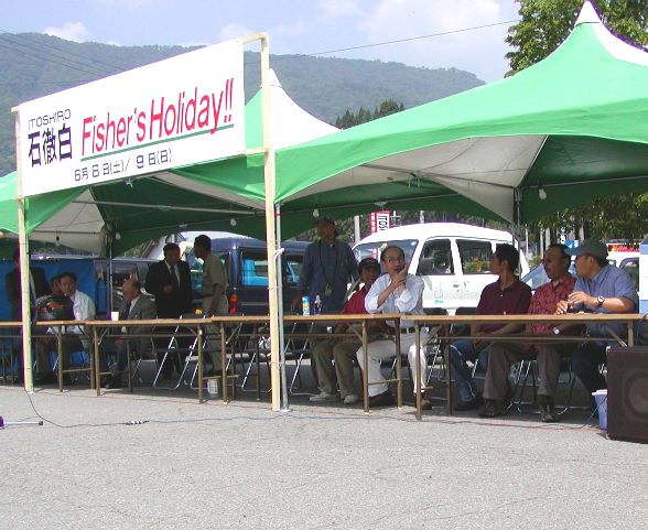 | 開会式の様子です 右から佐藤成史さん、杉坂隆久さん、岡田裕師さん、堀江渓愚さん、 榊原正巳さん、在来渓魚を殖やす会の斉藤さんです。 ![]() |